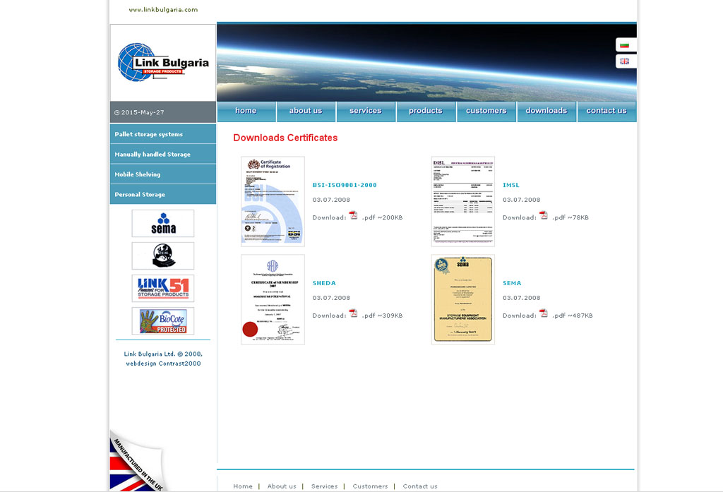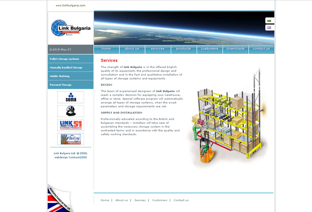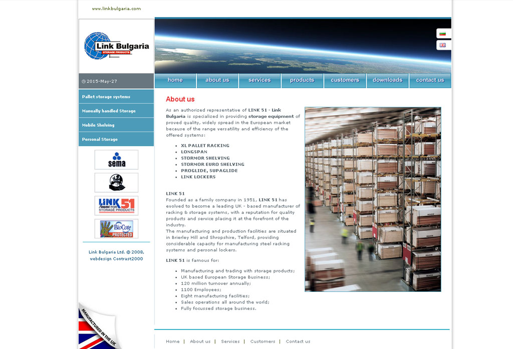 Уеб сайт Линк България Публикувана на 19.05.200803.02.2021 от webdesign Изработване на двуезичен уебсайт: Линк България Клиент: Линк България Описание: стелажи, стелажни системи, офис и складово оборудване Възможности: База данни с предлаганите продукти, Форма за обратна връзка Година: 2008