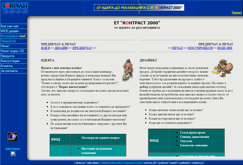 Уеб сайт Contrast 2000 Публикувана на 19.05.200121.03.2018 от webdesign Изработване на уебсайт: Print Contrast 2000 Клиент: Contrast 2000 Описание: Дизайн, Предпечат, Печат, Реклама Възможности: 52 статични html страници 5 анимирани технологични схеми Година: 2001