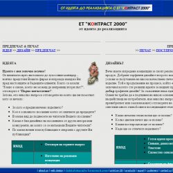 Изработване на уебсайт: Print Contrast 2000 Клиент: Contrast 2000 Описание: Дизайн, Предпечат, Печат, Реклама Възможности: 52 статични html страници 5 анимирани технологични схеми Година: 2001
